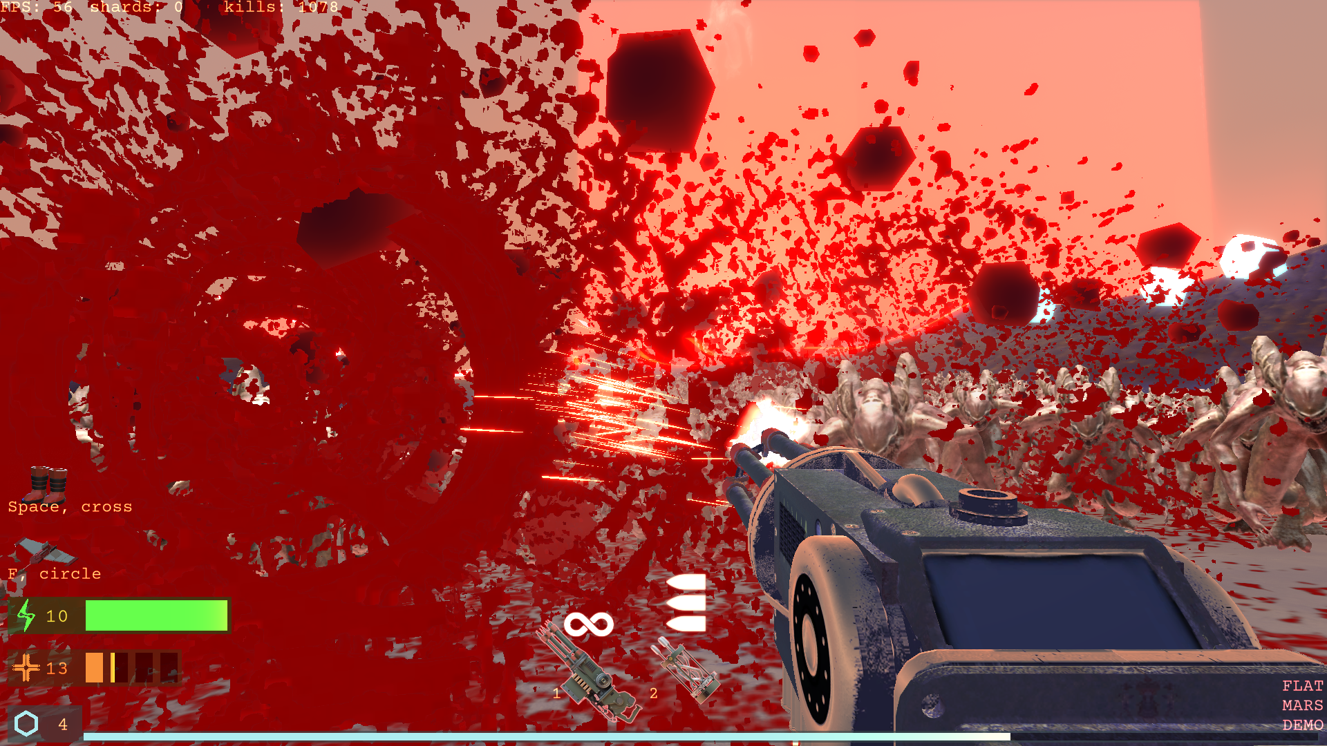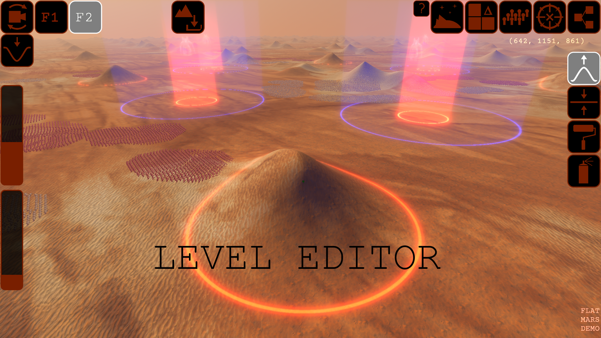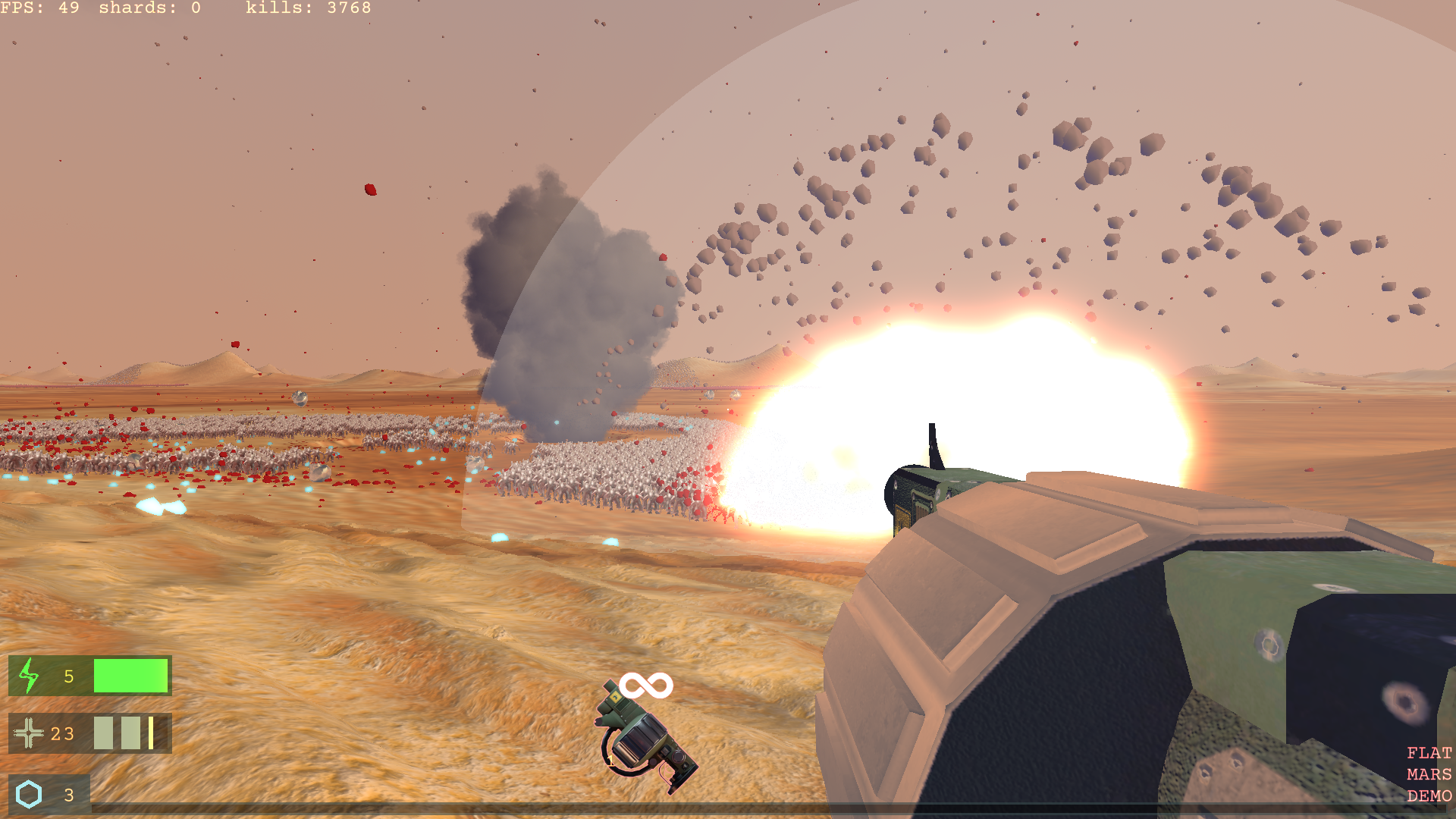 This is an early demo for Flat Mars. Try out the fully destructible terrain with up to 130K enemies at the same time. Create your own levels in the level editor.